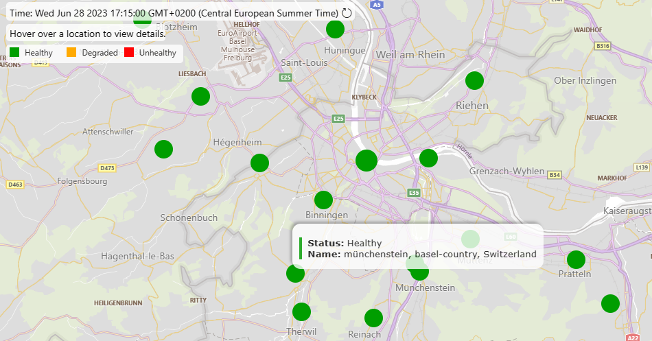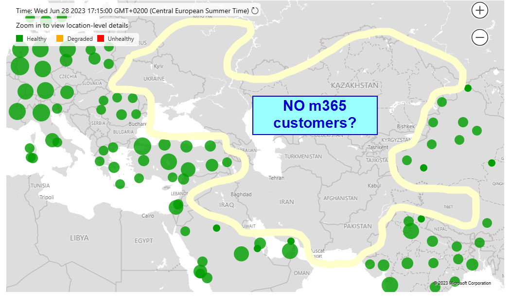 This map shows the network health status of locations where Microsoft receives a high volume of traffic from customers connected to Microsoft Teams, Exchange, SharePoint, and other services.