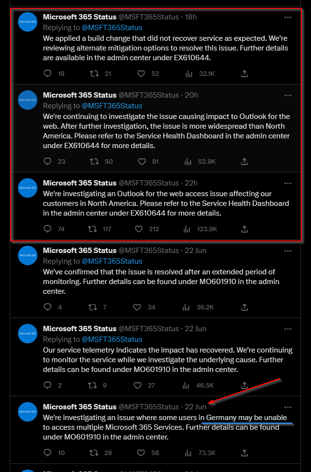 Checking the Twitter Status M365 (https://twitter.com/MSFT365Status/status) in the morning is a good way to anticipate what to expect before opening your IT Support Ticket system. This allows you to make informed decisions, such as staying at home or securing the IT support door. You may also think in long term about studying art or other jobs beyond relying solely on the Cloud-O-Matic-Manager (COMM) duty. Maybe you find time to check SLA you have with your customers or with the company who runs your cloud.